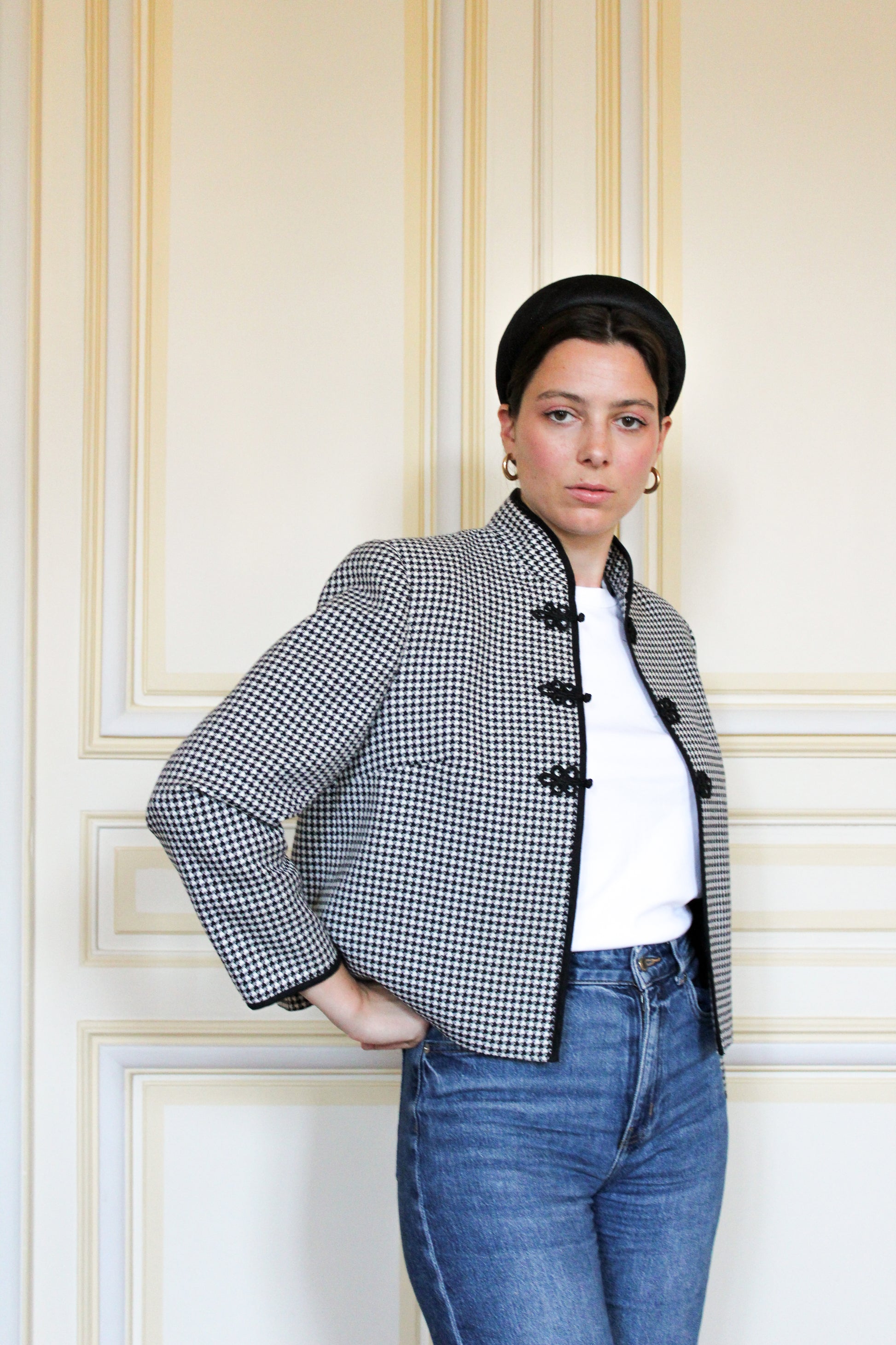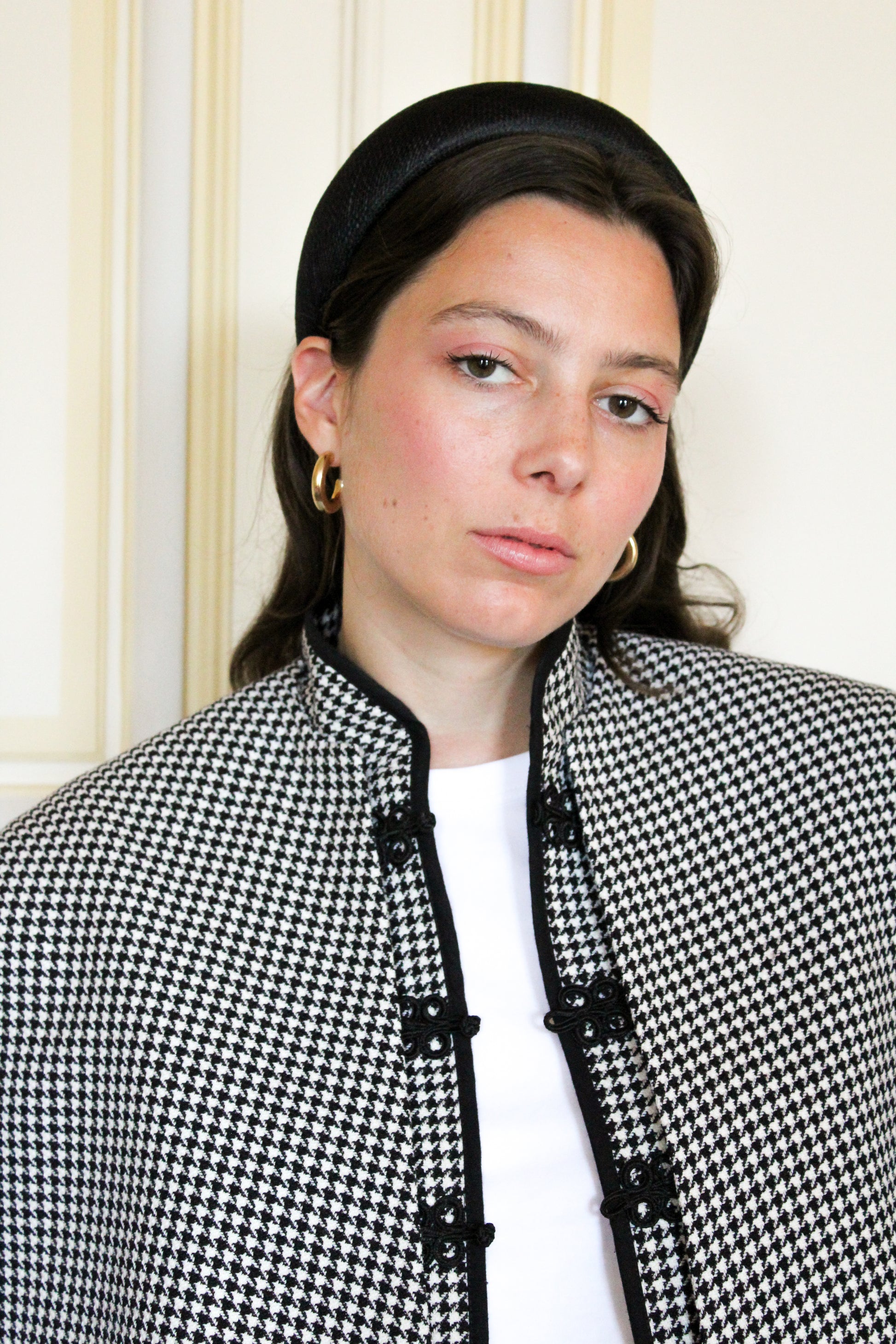 This iconic pied-de-poule wool jacket features a removable cape, offering versatile looks while keeping you stylish and warm.