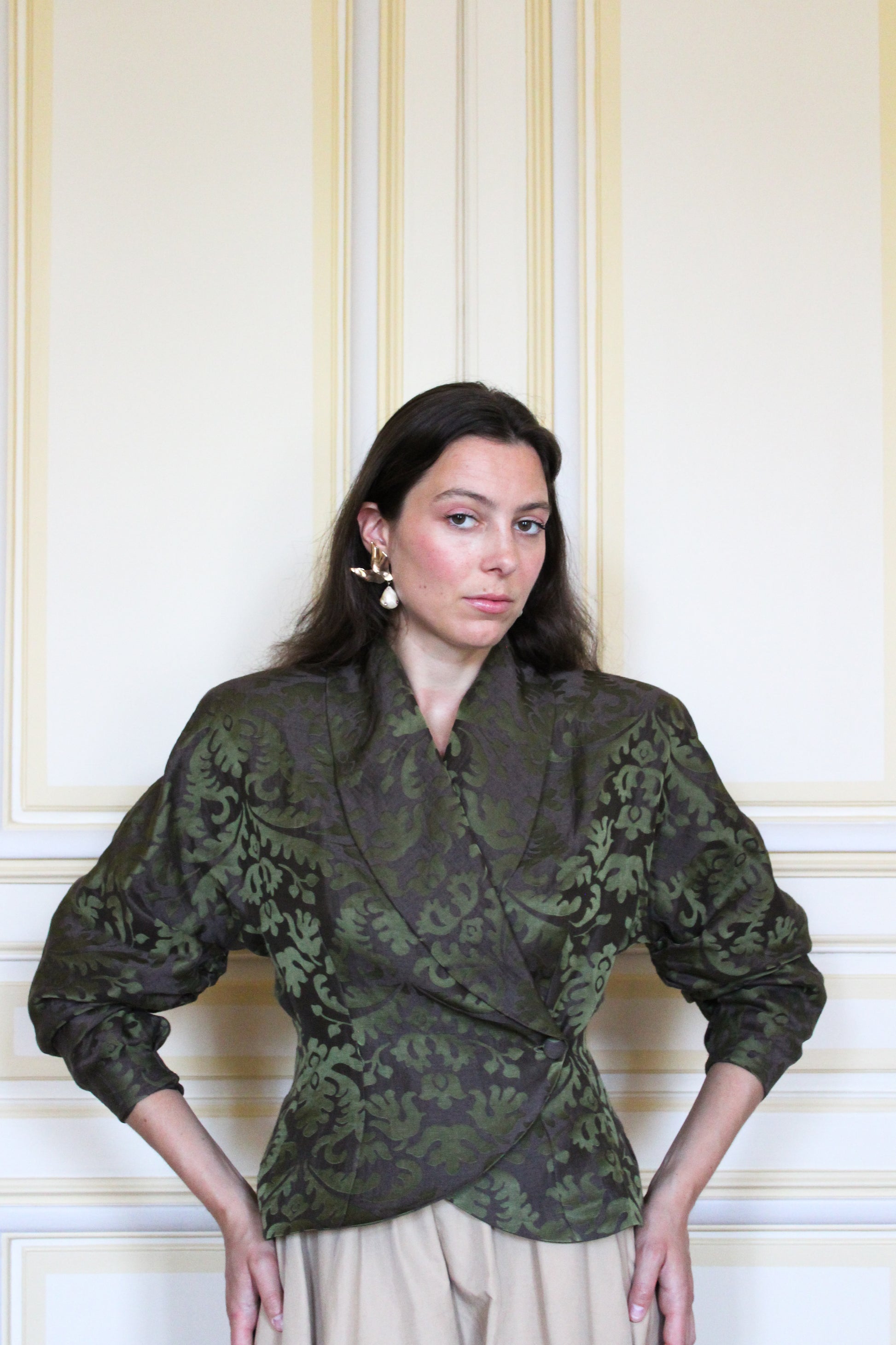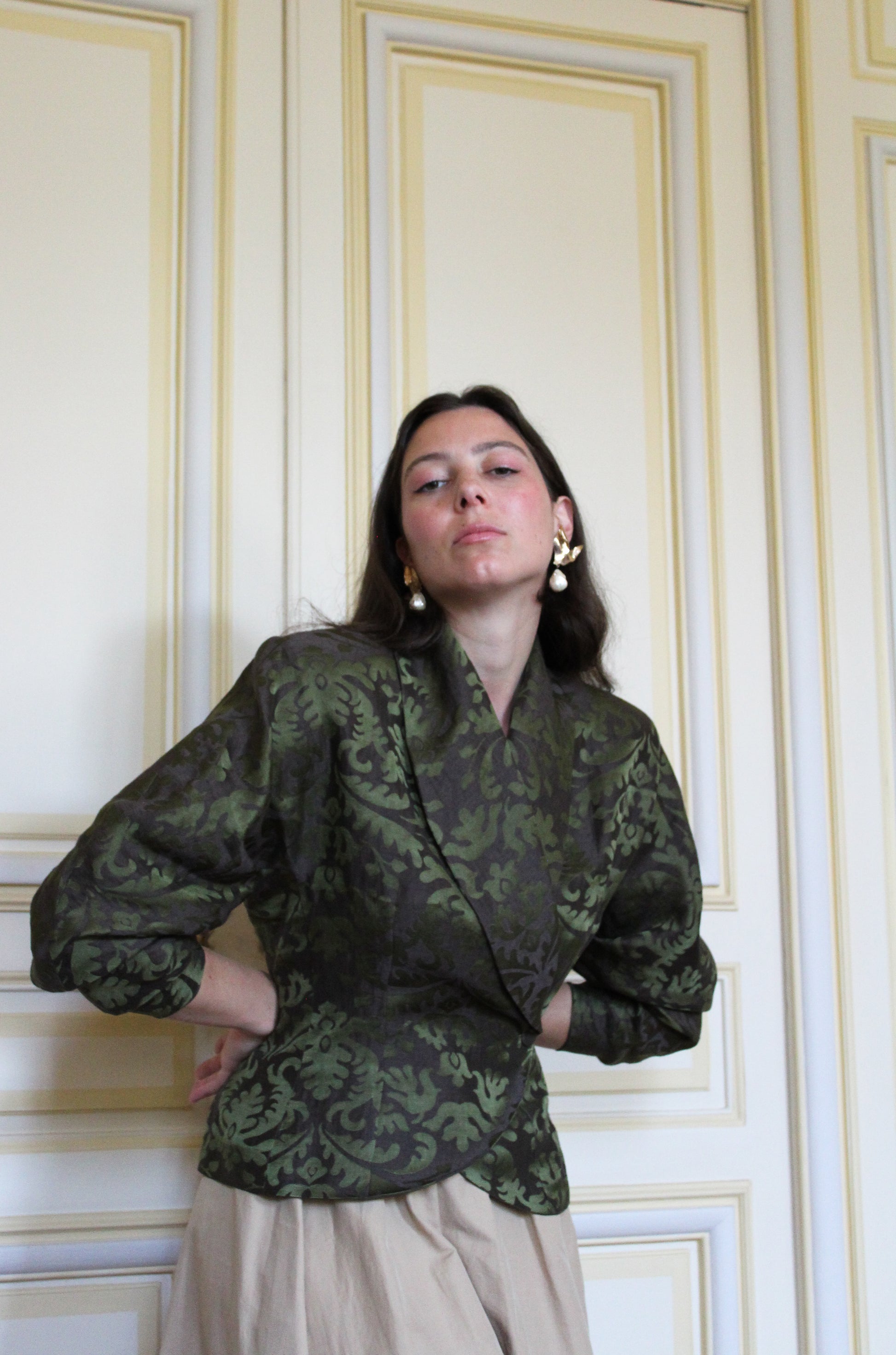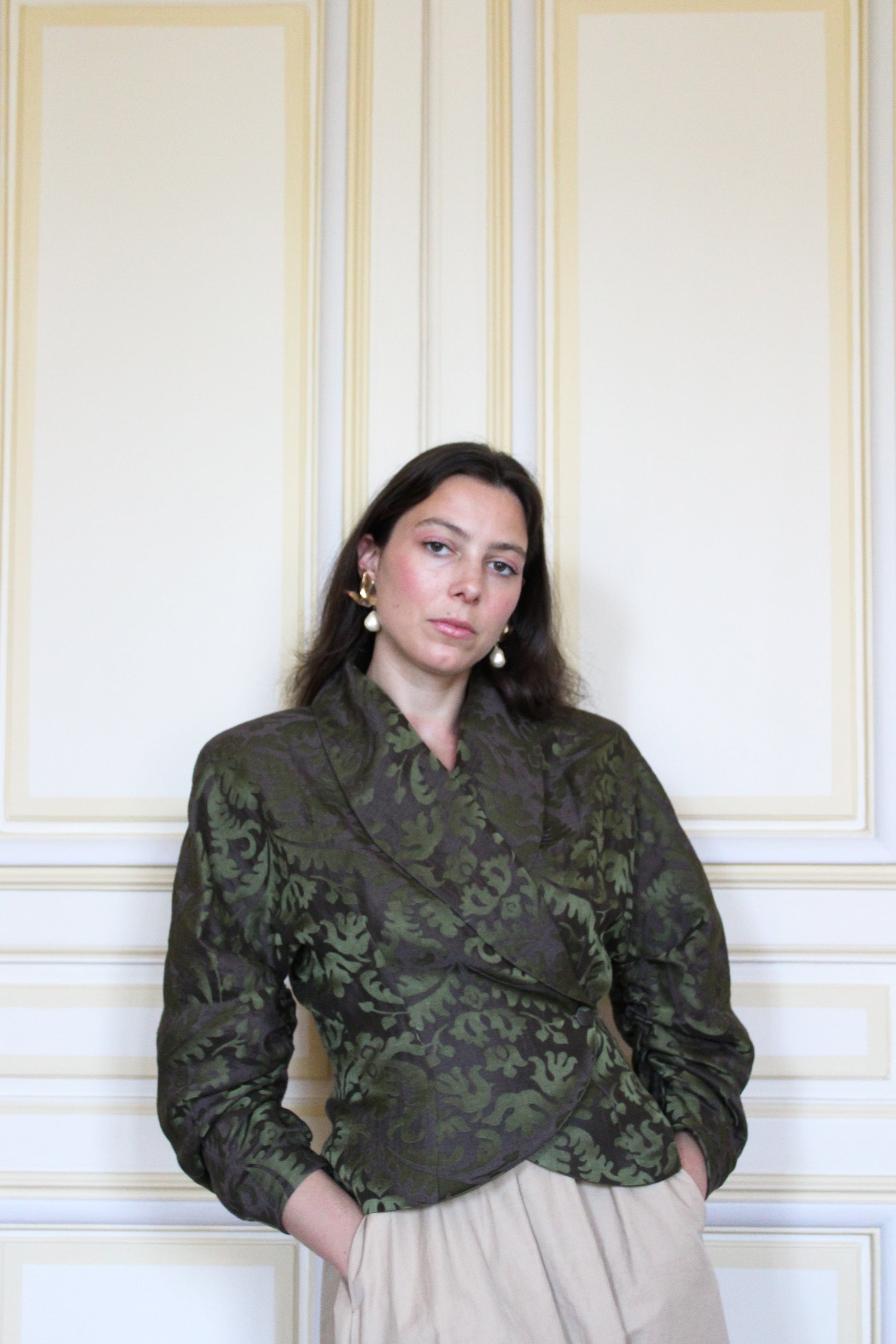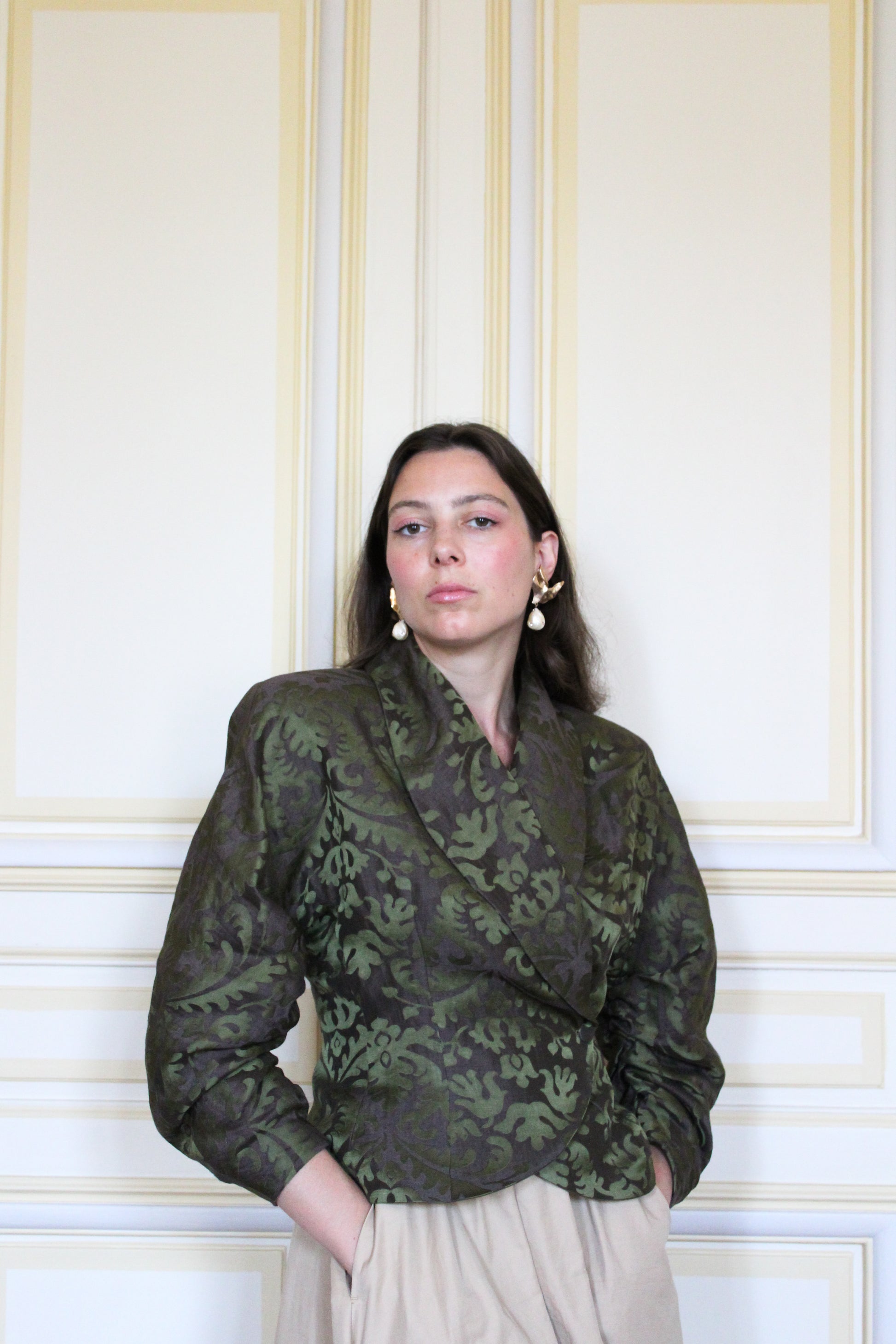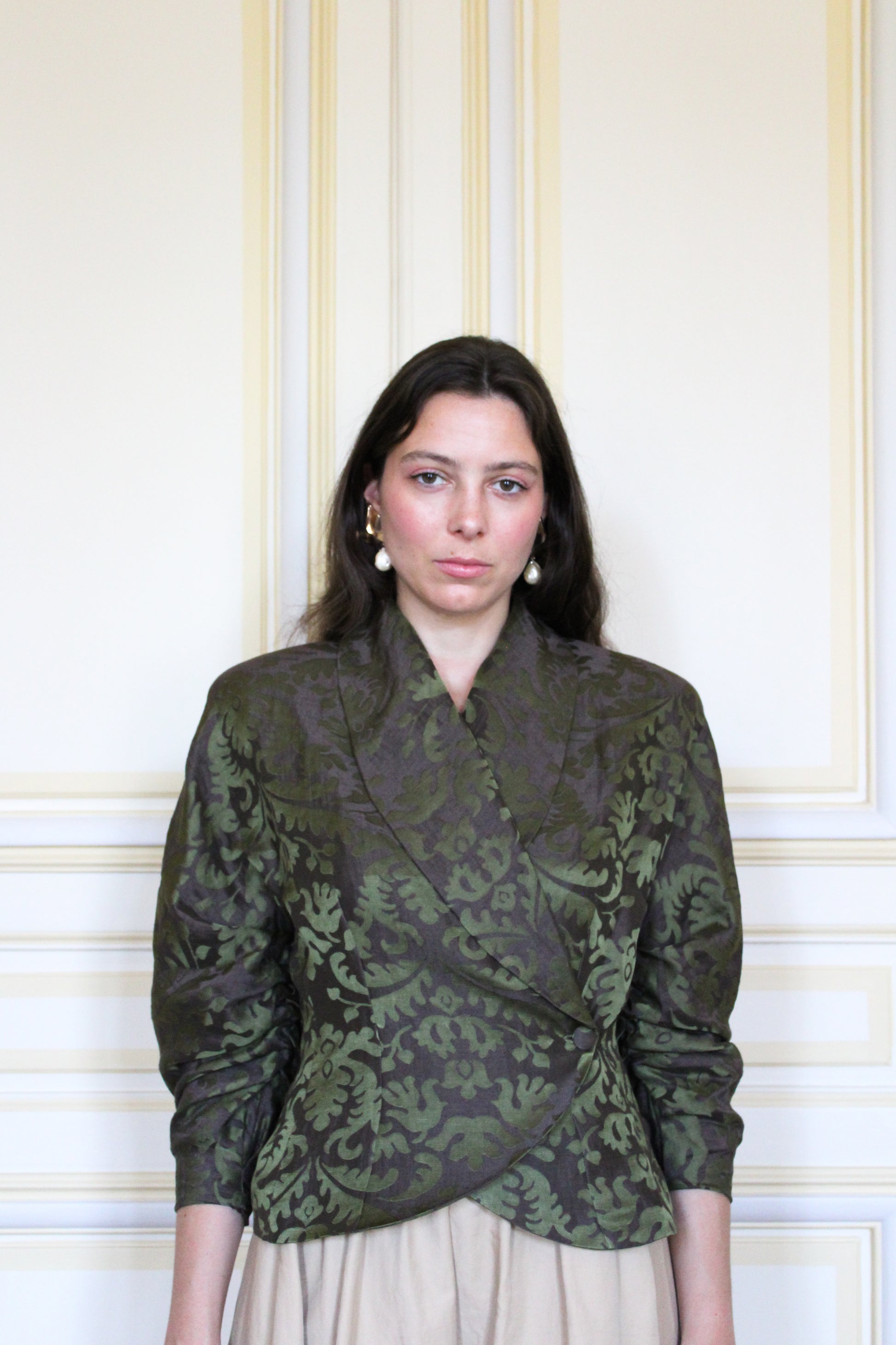 Our Jacquard Jacket is tailored from a luminous blend of linen and silk, carefully sourced from LVMH’s deadstocks. This gentle and exquisite fabric creates a sculpted drape.